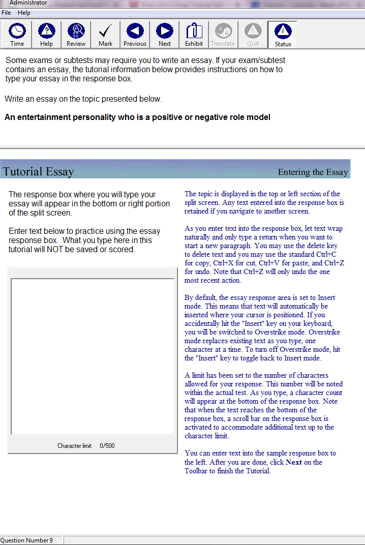 Some exams or subtests may require you to write an essay. If your exam/subtest contains an essay, the tutorial information below provides instructions on how to type your essay in the response box.